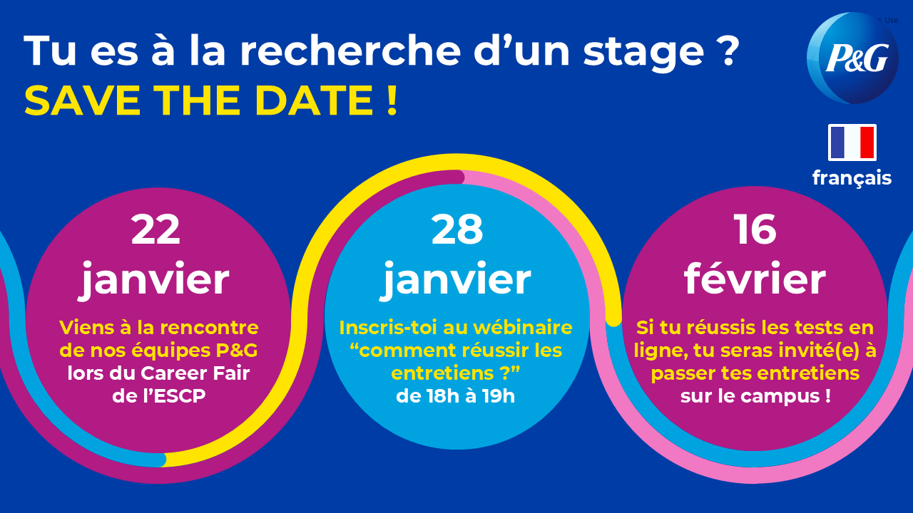 👉 Inscrivez-vous dès maintenant et préparez-vous à faire la différence ! Et n’oubliez pas d’aller rencontrer les équipes P&G France lors de la Career Fair de l’ESCP le 22 janvier pour en savoir plus sur leurs opportunités !